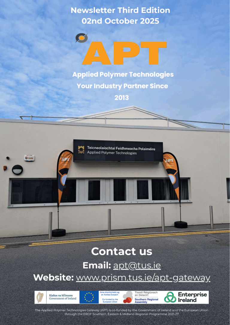 The PRISM RI is an internationally connected group of researchers specialising in the polymer research. Our aim is to develop industry relevant solutions to research questions spanning all aspects of polymer science and engineering. PRISM researchers are involved in a variety of national and international projects and centres including: the Enterprise Ireland Funded APT Technology Gateway Centre and the Meat Technology Ireland Technology Centre; Science Foundation Ireland centres for Advanced Materials and Bioengineering (Amber), Smart Manufacturing (Confirm) and Medical Devices (Cúram). At an EU level, PRISM researchers are contributing to polymer sustainability through ERA funded projects BIOICEP.EU (coordinator), Buddie-Pack and Interreg project Curcol, with PRISM researchers contributing to a variety of COST actions related to polymeric research. PRISM researchers represent TUS at the European composites, plastics and polymer processing platform and a variety of COST actions.